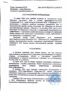 Один из наших собственников дошёл до суда. Сначала — Центральный районный, потом — Минский городской. И 12 марта 2026 года апелляционная инстанция поставила точку: договор «ОфисИнвест» с нами, оба ключевых приложения и дополнительное соглашение о повышении тарифов — всё это ничтожно. То, что мы говорили годами, суд наконец зафиксировал на бумаге. «ОфисИнвест» строил свою систему оплаты не на законе, а на нашей неосведомлённости. Пришло время разобраться, что именно они делали.
